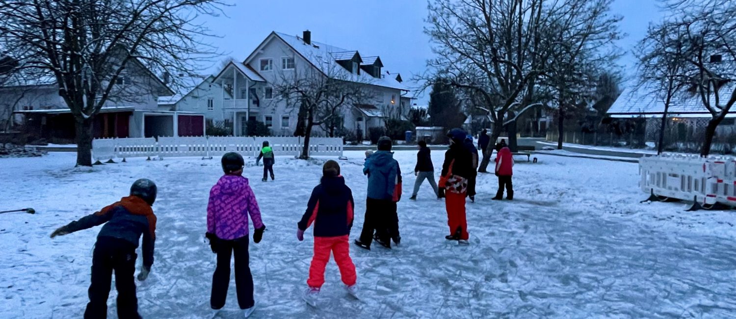 Nach jahrelanger Pause ist jetzt endlich wieder das Schlittschuhlaufen, das Rutschen oder auch das Eisstockschießen auf der Grünfläche an der Bajuwarenstaße möglich.